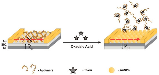 Pan et al. [51] developed an electrochemical label-free gap-based competitive bioassay to detect OA. Interdigitated microelectrodes were modified with AuNPs and self-catalytic growth of AuNPs was used as conductive bridges (conductive tag) (Figure 12). Growth efficiency of AuNPs directly amplifies the signal and is related to the catalytic activity of AuNPs. When there are no OA molecules in the sample, aptamers adsorb electrostatically onto the AuNPs surfaces, fully blocking the AuNPs catalytically active sites and impairing AuNPs growth. When OA molecules are added to the sample, they bind to the aptamer preventing its adsorption to AuNPs, letting AuNPs sites exposed to the occurrence of catalytic growth, inducing a large drop in charge transfer resistance (Rct). In essence, AuNPs function in sensor gaps as conductive bridges. The aptamer used was developed by Eissa et al. [50]. The sensor showed a LOD of 1 μg/L, a LRD from 5 to 80 μg/L, and Kd was 77 nM.