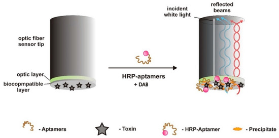 Real-time optical biosensor developed by Gao et al. [62] for palytoxin (PTX) detection, using coupled biolayer interferometry (BLI) and an enzyme-linked aptamer in a competitive binding assay. Binding events shift the interference spectrum of the reflected light. After being in contact with the sample, the biosensor tip with the PTX:HRP-aptamer complex attached was immersed in a 3,3′-diaminobenzidine (DAB) solution, resulting in the formation of a precipitate on the sensors surface, with subsequent signal amplification. HRP-horseradish peroxidase.
