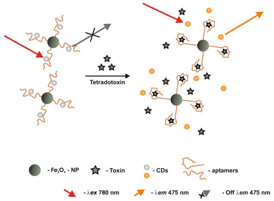 - Jin, H.; Gui, R.; Sun, J.; Wang, Y. Facilely self-assembled magnetic nanoparticles/aptamer/carbon dots nanocomposites for highly sensitive up-conversion fluorescence turn-on detection of tetrodotoxin. Talanta 2018, 176, 277–283. [Google Scholar] [CrossRef] [PubMed]