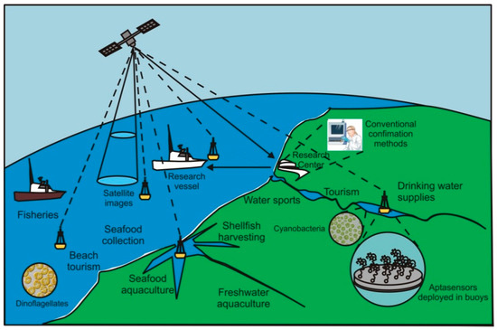Toxins may kill the organism or cells used to produce antibodies, while no toxic effects are possible on aptamer synthesis. Real-time aptasensors seem to be an ideal tool for aquatic toxins monitoring, as results are provided in a more immediate way, which suits best the management of urgency and risk that those toxins pose to human, animal or ecosystems health. They also suit risk assessment associated with long-term exposure to low concentrations of toxins, since their limits of detection tend to be as low as (or lower than) conventional laboratory methods performed with heavy equipment and highly skilled staff and, below the detection limits imposed by the legislation. They may be mounted on high throughput multiplexed sensitive detection platforms for routine analysis of water samples, in the field, e.g., in oceanographic buoys, due to their stability at ambient temperature and minimal sample preparation needed.
