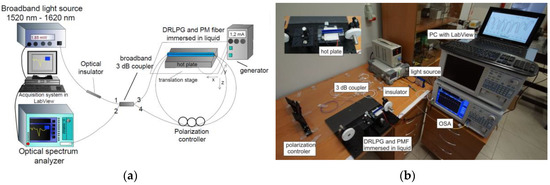 The proposed sensor (see Figure 1) consists of a broadband light source with a range of 1520–1620 nm, an optical insulator, a wideband single-mode 3 dB fiber-optic coupler, a 0.31 m length of PM fiber (HB 1500 bow-tie type, Fibercore, Southampton, UK), a manual fiber PC (FPC030 3-Paddle PC, Thorlabs, Newton, NJ, USA), a DRLPG, and an optical spectrum analyzer (OSA) (86142B, Agilent, Santa Clara, CA, USA) with a resolution of 0.1 nm [30]. The input light from port 1 passes through the 3 dB coupler and the optical insulator, which protects the light source from the back reflections. Here, light is split into two beams that counter-propagate from ports 3 and 4 and travel around the loop. The beams propagate simultaneously through the DRLPG and the PM fiber, so that their individual polarization varies and the beams interfere in output port 2. The OSA and light source were operated using a data acquisition system in the LabView environment, where the reference spectrum from the source was actually subtracted from the output signal in terms of limiting its influence on investigated features.