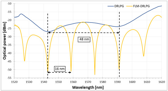 The proper wavelength characteristic is estimated by investigating PM fiber length and DRLPG wavelength influence [30,31]. The length of PM fiber was estimated in relation to the birefringence and the wavelength spacing between interference dips (16 nm) [39], which was matched to the spacing between DRLPG notches (48 nm) (Figure 2). The PC localization between the DRLPG and the PM fiber directly determines the peak amplitude and position. This implies that the PC can be used to control the behavior of the transmission spectrum and, hence, to tune the dips. For the type and length of PM fiber chosen in this test, it is possible to move the interference dips up to 9 nm and the amplitude about 11.25 dBm. For the final system adjustment, the two spectral peaks of the FLM were located in the middle of both notches of the DRLPG, as is shown in Figure 2.