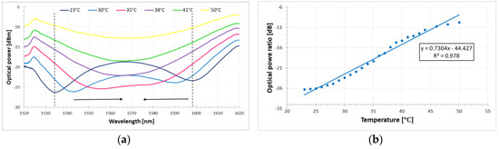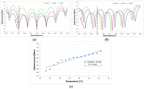 It is worth noting that the performance of the proposed platform is affected by connection losses between the various optical components, by the sensitivity range of the OSA and by the bandwidth of the light source. In the experiment reported here, a low-power light source was used due to the short length of the sensor, and thus, the optical power of the presented transmission spectra is low. Special applications of the proposed sensor for remote measurement would require a higher-power optical source.