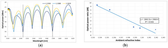 The ambient RI response was measured in a temperature-controlled environment under variations of about 0.1 °C. A similar optical configuration was either proposed in terms of ambient RI measurement maximization [30]. However, the temperature influence has been completely omitted. The effect on the spectral response of the FLM-DRLPG structure induced by ambient RI variation is shown in Figure 5a. Despite the fact that the dips move slightly toward shorter wavelengths, the amplitude decreases with increasing RI of the liquid. For this reason, to estimate the ambient RI response of the setup, the ratio between the optical power of the two dips is monitored. This approach is justified because of the high extinction ratio of the existing interference dips in the FLM signal. The difference between the interference dips associated with the DRLPG notches is calculated, and the relationship between amplitude difference and ambient RI is also obtained. Through linear fitting (see Figure 5b), the sensitivity to the liquid RI variation is estimated to be 1841.5 dB/RIU with acceptable fitting coefficient equal to 0.926. In comparison with Chu el al. in [41], the present study obtained one order of magnitude higher ambient RI sensitivity expressed as the optical power ratio of the peaks.