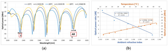 When both the ambient RI and the temperature change simultaneously, the transmission spectra are affected by both parameters. The measured response of the proposed sensor under these conditions is shown in Figure 6. It can be seen that when the temperature change is applied, the interference dips shift toward shorter wavelengths. On the other hand, when the ambient RI of the liquid is increased, the interference dips move toward longer wavelengths (see Figure 6a). It is noticeable that optical power for the dips varies as well, thus one can monitor the sensor response as optical power for dip change or as the optical power ratio between two interference dips. However, taking into account the ambient RI behavior of the transmission spectra of the DRLPG, one can monitor the response of the sensor as the optical power ratio of the two interference dips (λ = 1542 nm and λ = 1590 nm), corresponding to the two notches of the DRLPG. The sensor response for a chosen wavelength is presented in Figure 6b. In this case, the maximum ambient RI sensitivity of 2375.8 dB/RIU and temperature sensitivity of 1.1 dBm/°C with respective fitting coefficient equal to 0.935 and 0.977 is obtained. The relatively high scattering of the measuring points of the dual-parameter sensor may be attributed to the fact that the response is measured as an optical power for the dip change instead of a wavelength shift and the interference and resonance peaks should overlap in the entire RI and temperature measuring range. In this case, as shown in Figure 5a (wavelength between 1530 and 1540 nm), the optical power for the dip varies. To reduce scattering, in the future, a DRLPG with greater distance between the two LPG notches will be used. Of course, since sensitivity depends on the length or the birefringence of the PM fiber, or both, a longer fiber or one with higher birefringence is required to obtain greater thermal sensitivity.