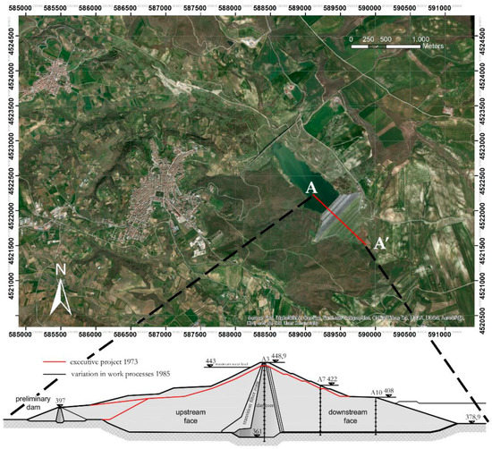 (a) Ortophoto of the Genzano di Lucania reservoir; (b) main cross section of the dam (modified in December 1985 from the initial configuration indicated by red lines.