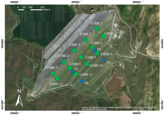 Position of the installed extensometers USBR model (green circles) and piezometers (blue squares) on the dam.
