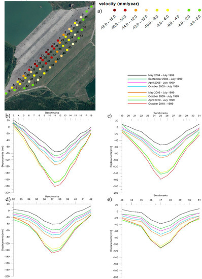 Results from the geodetic surveying: on the top, (a) the location of the benchmarks classified by their average velocity; bottom, cumulated displacements along the four benchmarks alignments divided for subsequent period; (b) from benchmark 3 to 18; (c) from benchmark 19 to 31; (d) from benchmark 32 to 42; (e) from benchmark 43 to 51.