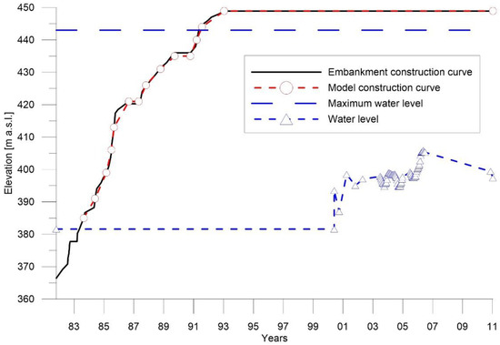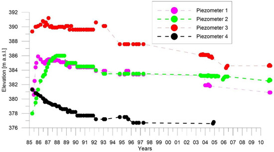 Figure 8 shows the evolution of the piezometric levels. The dam construction started in 1981 and was completed in 1993. The piezometers investigated, placed in the foundation of the downstream dam (P1-P2-P3-P4) showed in Figure 6 (blue squares), exhibited a pore pressure growth related with increased total stresses caused by the build-up of dam weight with a maximum pressure coinciding with the completion of the dam. After dam construction, the piezometers showed a continuous decrease due to the gradual reductions in excess pore pressure. This long-term deformation might be expected due to soil consolidation processes.