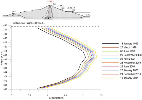 In the Extensometer 7 (Figure 10), the trend of the curves indicates that, after the conclusion of the embankment’s construction up to a height of 422 m a.s.l., on 28 January 1987, a rigid shift towards the positive abscissae of the assestimetric diagram is observed [12]. This being a symptom of consolidation settlement in the foundations.