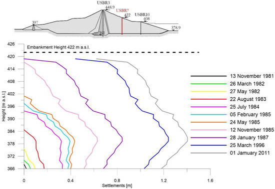 Extensometer USBR 7: settlement profiles observed during construction and working phases.