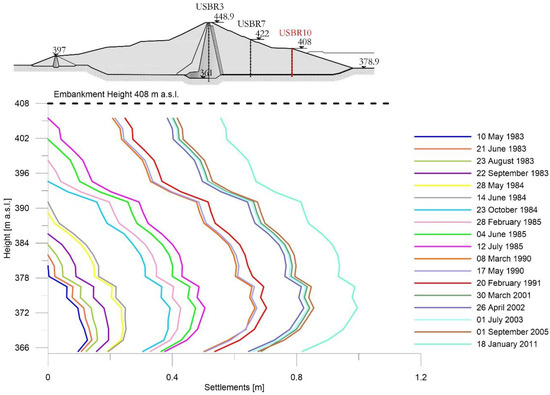 Extensometer USBR 10: settlement profiles observed during construction and working phases.