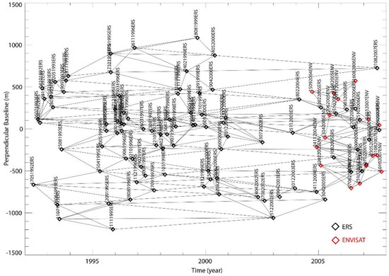 Sketch of the SAR data distribution in the temporal/perpendicular baseline plane. The black and red diamonds represent the ERS and ENVISAT acquisitions, respectively; each arc of the graph corresponds to a generated interferogram.