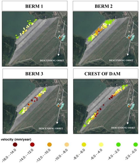 The results obtained from the SBAS-DInSAR analysis have been processed in a GIS environment, where it was possible to analyse both the annual velocity maps and the deformation time series, describing the settlements observed on the dam of Genzano between 1992 and 2007. The annual average velocity map is available on the dam crest and on the upstream slope (covered with rip-rap material). On the downstream slope, there are not “coherent” points that can be observed with advanced-DInSAR technique. The DInSAR results extended for about 15 years (1992–2007), clearly show that part of the dam is subsiding (Figure 10) with a maximum average velocity of 15.5 mm/year. Results show that vertical displacements reached maximum values of 232.5 mm for the 1992–2007 period along the crest of the dam, almost exhausted, at the toe of the embankment.