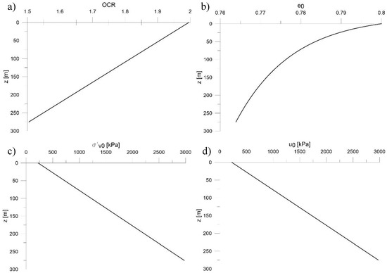 Initial conditions of modelled soil, (a) initial over consolidation ratio OCR; (b) initial void index e0; (c) initial effective vertical stress σ’v,0; (d) initial pore pressure u0.
