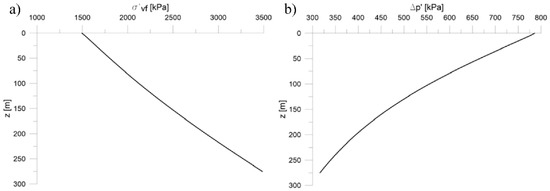 Final conditions of modelled soil, (a) final effective vertical stress σ’v,f; (b) increase of effective isotropic pressure Δp.’