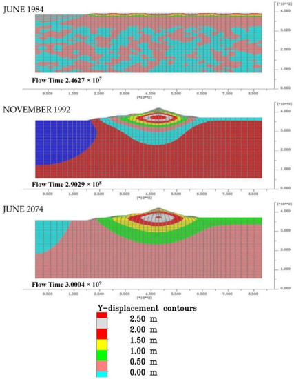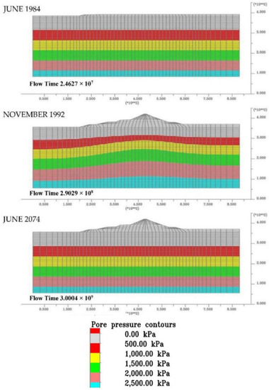 Some results of greater interest in terms of excess pore pressure and vertical displacements are reported for different time-steps. The contour lines of the excess pore pressure, Figure 25, exhibit a growth related to the increased total stresses caused by a build-up dam weight with a maximum pressure concurrent with the completion of the dam (1992). After dam construction, we can notice a slow exhaustion of the pore pressure, due to the consolidation process of the clay foundation, until 2074, the year in which consolidation is considered exhausted.