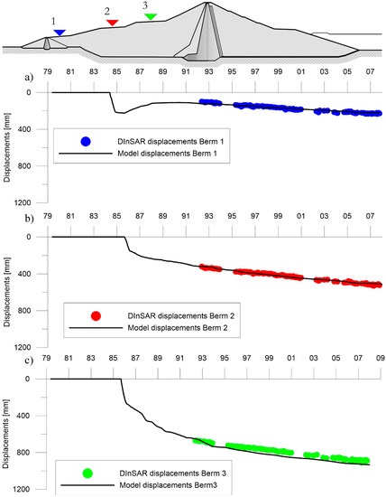 Comparison between DInSAR observed displacement and model obtained displacement for: (a) berm 1; (b) berm 2 and (c) berm 3.