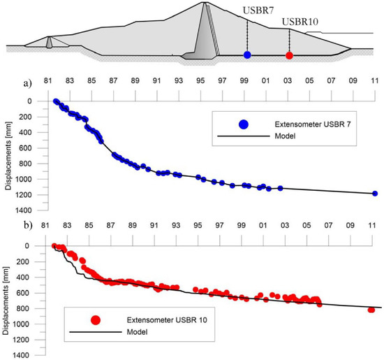 Comparison between extensometer measured displacement and model obtained displacement for: (a) extensometer USBR 7 and (b) extensometer USBR 10.