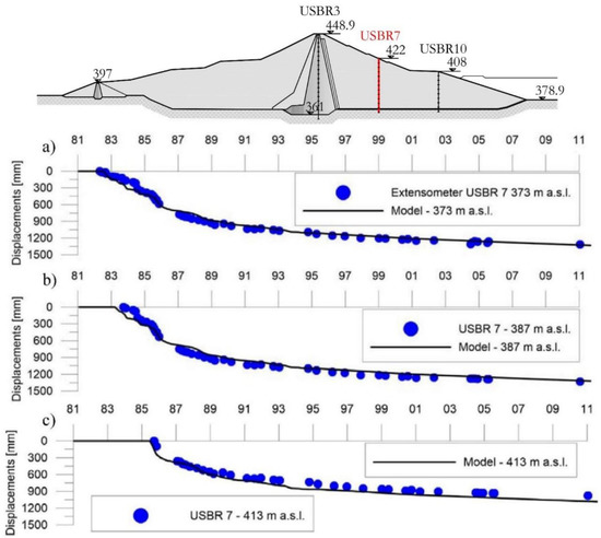 Comparison between extensometer measured displacement and model obtained displacement for USBR 7 at different heights: (a) 366 m a.s.l.; (b) 381 m a.s.l.; (c) 413 m a.s.l.