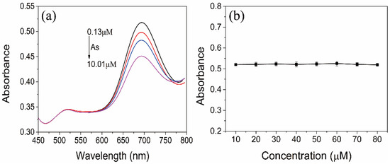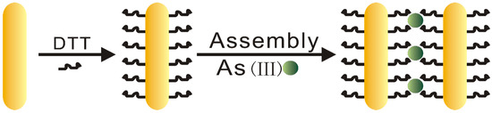 Arsenic (As) is an inorganic element with high toxicity and occurrence abundant in the environment samples including soil, water, food, rain and vegetations which has attracted great attention worldwide [1,2]. Arsenic has several oxidation states (−3, +3, 0, and +5) in the environment but in water samples it is mostly found as trivalent arsenite or pentavalent arsenate. A number of diseases including cancer, skin damage, problems with cardiovascular, nervous system, respiratory system and blood system are closely related with the continuous intake of As(III) in drinking water [3,4,5]. World Health Organization (WHO) and Environmental Protection Agency (EPA) both set a provisional guideline of 133 nM (10 μg·L−1) for maximum arsenic content in ground water in 1993 [6,7]. Several analytical methods have been established to determine the concentration of arsenic in various samples. Many analytical methods with expensive instrumental have been applied to detect arsenic in environmental matrices, such as high performance liquid chromatography combined with inductively coupled plasma mass spectrometry (HPLC–ICP-MS) [8], hydride generation atomic fluorescence spectrometry (HG-AFS) [9], atomic fluorescence spectrometry (AFS) [10], inductively coupled plasma mass spectrometry (ICP-MS) [11], electrochemical method [12,13,14] and atomic absorption spectroscopy (AAS) [15]. Furthermore, various simple, rapid, sensitive and inexpensive methods was also investigated. Fluorescent probe based on CdS quantum dots and Carbon dots have been developed to detect the concentration of arsenic in ground water samples with satisfactory recovery [7,16]. Colorimetric probes based on gold nanoparticles have been also established for determination of arsenic [17,18]. Among these methods, the colorimetric method attract more attention due to the unique merits of simplicity, speediness, sensitivity and low cost.