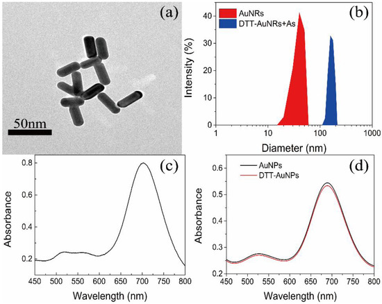 (a) TEM image of AuNRs; (b) Size distribution of AuNRs and DTT-AuNRs exposed to As(III); (c) UV–vis absorption spectra of CTAB-coating AuNRs; (d) UV–vis absorption spectra of AuNRs and DTT-AuNRs.