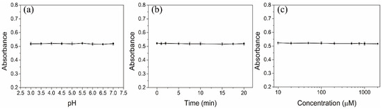 In addition, in order to evaluate the stability of the DTT-AuNRs colorimetric probe to ensure the sensitive and selective sensing performance, some experiment conditions including pH values, reaction time and concentration of NaCl were carried out by recording the absorption value. As showed in Figure 4a, NaAc-HAc buffer (10 mM) with pH values range of 3.0–7.0 can keep the stability of DTT-AuNRs. Moreover, the reaction time produced negligible effect to the absorption value of DTT-AuNRs within 20 min. In addition, the concentration of NaCl range of 10–2000 μM also show high stability of DTT-AuNRs. The above results means that the as-prepared the DTT-AuNRs colorimetric probe have excellent stability in the absence of As(III) ions which can prove that the colorimetric probe will maintain high stability and uniformity before As(III) ions addition.