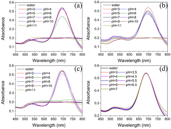 Effects of pH and buffer media on UV-vis spectra of AuNRs: (a) 10 mM PBS; (b) 10 mM Tris-HCl; (c) BR buffer; (d) 10 mM NaAc-HAc.