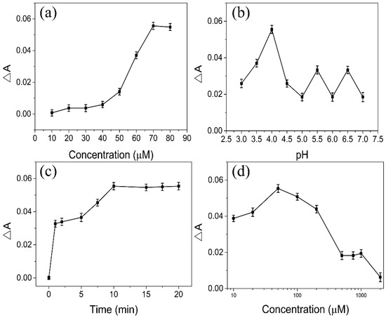 The concentration of DTT will affect the sensitivity of sensing As(III) ions, a low concentration of DTT will show weak response to As(III) ions and high concentration of DTT will induce the aggregation of AuNRs, thus the different concentration of DTT was optimized. As showed in Figure 6a, the ΔA of DTT–AuNRs system increases slowly with the increase of DTT concentration within 50 μM and increases significantly upon the concentration of DTT reaches to 70 μM in the presence of 6.67 μM As(III) ions. Therefore, the final concentration of DTT was chosen 70 μM to modify AuNRs.