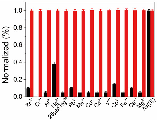 Selectivity test of the developed colorimetric probe for As(III) ions (6.67 μM) over other metal ions (50 μM, except for Hg2+, 25 μM). Black bars denote the responses of individual metal ions, while red bars show the responses of As(III) (6.67 μM) in the presence of other metal ions.