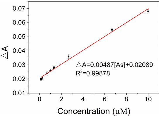 Under the optimal conditions, the linearity and detection limit of DTT-AuNRs colorimetric probe were constructed. As displayed in Figure 8, after adding increasing concentration of As(III) ions into DTT-AuNRs colorimetric probe in NaAc-HAc buffer at pH 4.0 result in an obvious decrease of the longitudinal SPR absorption intensity of DTT-AuNRs colorimetric probe due to the strong and specific affinity of As(III) ions to the dithiothreitol and a linear relationship between the ΔA of the DTT-AuNRs colorimetric probe, and the linear equation ΔA = 0.00487 [As] + 0.02089 with a correlation coefficient R2 = 0.99878 was observed, the calibration plot exhibits an excellent detection range of 0.13–10.01 μM, in addition, the limit of detection (LOD) was estimated to be 38 nM by rules of 3 σ/k. The above results suggest that the proposed DTT-AuNRs colorimetric probe have huge potential for determination of As(III) ions in actual sample with low concentration level.