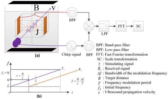 Magneto-acoustic-electrical tomography (MAET) imaging process using linearly frequency-modulated theory (MAET-chirp pulse stimulation (CPS)): (a) principle of the MAET-CPS; (b) frequency characteristics of the stimulating signal and the received signal.