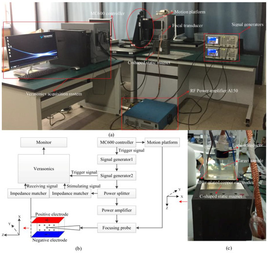 The proposed MAET-CPS system consisted of an ultrasonic focusing probe, a three-dimensional motion system, a Verasonics acquisition system, two signal generators, a C-shaped static magnet, a power amplifier, two impedance matchers, a power splitter, a high power single element transducer, two silver-plated copper electrodes, and a plastic sink container. A 3D motion system (MC600, ZOLIX Instruments Inc., Beijing, China) was used to control the movement of the probe and included a motion controller and a motion platform. A focusing probe (CDC-10963-4, IMASONIC Inc., Voray sur l’Ognon, France) was used to generate the ultrasonic pulse to make local ultrasonic vibration on the ultrasonic path. The Verasonics acquisition system (Vantage Advantage 256, Kirkland, USA) was adopted to perform digital signal processing of the received voltage signal and the stimulating signal, such as preamplification, 14-bit analog-to-digital conversion, sampling, amplifying, band-pass filtering, digital multiplication, low-pass filtering, fast Fourier transformation (FFT), and scale transformation. The MC600 motion controller (MC600, ZOLIX Instruments Inc., Beijing, China) was used for system timing sequential control and performing the step scanning motion. Signal generator 2 (AFG3102, Tektronics Inc., Rocky Point, NY, USA) was used to generate a beam of linear frequency modulation excitation signals with a bandwidth of 1 MHz, a center frequency of 2.5 MHz, and a linear frequency modulation period of 1 ms. To improve the signal to noise ratio of the MAET-CPS system, Signal generator 1 (AFG3102, Tektronics Inc., USA) was used to generate 10 rectangular pulse signals with the period of 1 s for signal averaging. The system’s physical diagram is shown in Figure 1a.