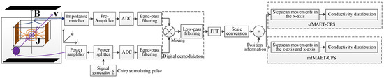 In our proposed MAET system, MATLAB was utilized as the programming language, and data acquisition and movement of the probe were controlled by the MC600 controller. A pair of silver-plated copper electrodes attached to the surface of the imaging body was used to detect the surface voltage signal of the phantom. In addition, both the chirp excitation signal and the received voltage signal were used to perform the preamplification, the ADC acquisition, the mean calculation, and the band-pass filtering through the Verasonics acquisition system. By mixing the signals, the intermediate frequency (IF) signal was derived after low-pass filtering and fast Fourier transformation (FFT), and the conductivity curve along the pulse propagation direction was achieved after scale transformation (SC). According to the different stepscan movements, and combined with the position information of the stimulating probe and the conductivity curve, the electrical conductivity distributions of the sfMAET-CPS and the mfMAET-CPS were derived by two different reconstruction algorithms, respectively. The process flowchart of the two methods is presented in Figure 3.