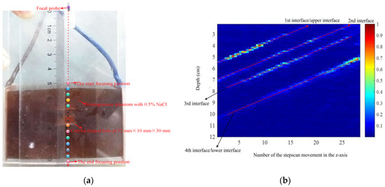 To test the effect of the different single-point focal positions on the amplitude of electrical conductivity, a focal probe was controlled for step scanning only in the z-axis. The phantom with a cuboid-shaped hole was exploited to conduct stepscan movements for demonstrating the effect of single focal-point excitation at different positions on conductivity imaging, and an ultrasonic single-element probe with a depth of focus of 50 ± 2 mm was placed above the hole and placed at the 54 mm position above the upper surface of the homogenous phantom. When the focal point was at the start focusing position, the probe sent 10 chirp signals to stimulate the target phantom; 10 surface voltages of the phantom were received by a pair of silver-plated copper electrodes placed close to both sides of the target sample. Both stimulating signals and received signals were averaged and a conductivity curve from the probe to the bottom of the phantom was obtained after the digital coherent demodulation between the instantaneous stimulating signal and the received signal. Then, the probe moved to a step length (1.8 mm) to reach the second focal point to obtain the second conductivity curve along the ultrasonic excitation direction, repeating the aforementioned operation and stepped excitation of the phantom. Thirty stepscan movements of the probe were conducted in the z-axis and the focal point of the probe passed through the hole and moved from the start focusing position to the end focusing position. The movement track of the stimulating position at each focal point is shown in Figure 4a, in which the influence of single-focus imaging on the amplitudes of conductivity variation was clearly presented. When the focus point was close to the first interface, the conductivity amplitude at the first interface position became increasingly brighter. As the focal point was farther away from the first interface, the electrical conductivity amplitude at the first interface position became increasingly weaker. When the focal point was close to the second, third and fourth interfaces, the conductivity amplitude of the probe was also getting increasingly brighter and then became darker as the focal point was farther away from the interfaces. As the focal point of the probe was fixed from the probe position, when the probe stepped up excitation of the phantom, the conductivity curves obtained at each excitation position were from the probe to the bottom of the phantom, so the obtained conductivity curves referred to the position of the probe. After normalization of the conductivity values extracted from the 30 conductivity curves, the conductivity values were displayed by the color brightness. The above results could be reflected by the brightness of the conductivity of the four interfaces as shown in Figure 4b, and the unit of measure of the brightness was the conductivity amplitude after normalization.