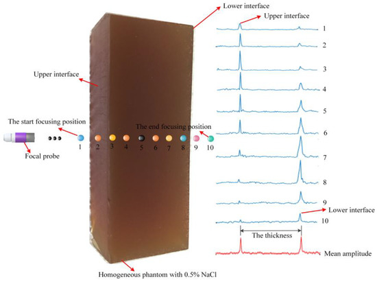 To further verify the influence of the different single-point focal positions on the amplitudes of conductivity variation, a homogenous gelatin phantom was used to carry out an experiment. In the beginning, the probe was placed at the 54 mm position above the upper surface of the homogenous phantom, and the distance from the start focusing position to the upper interface of the phantom was approximately 4 mm. Then, the chirp stimulating signal was generated and the surface voltage signal was received by the electrodes. When the focal point was at the start focusing position, the conductivity curve along the ultrasound stimulation direction was obtained after processing by the Verasonics system, and then the focal point moved down a step length to the second focusing position to get the second conductivity curve, repeating the aforementioned operation. The focal point of the probe was controlled to move from the start focusing position to the end focusing position, and 10 stepscan movements of the probe were carried out in the z-axis. After combining the ultrasonic excitation signal and the measured voltage signal from the surface of the tissue, the electrical conductivity curves were derived when focus points were at different single-point excitation positions, and the amplitude variations of the conductivity curve of the 10 stepscan movements in the z-axis are shown in Figure 5. From Figure 5, the conductivity amplitudes at the two interfaces were seriously influenced by the excitation positions of the single focus point, The amplitude of the conductivity curve at the upper interface became larger and then gradually became smaller as the single-focus point moved, and the amplitude of the conductivity curve at the lower interface gradually increased when the focal point moved gradually closer to the lower interface, which then gradually decreased as the focal point passed through the lower interface. In addition, the average of 10 conductivity amplitudes at the upper interface was almost equal to that at the lower interface; the two peak values on each conductivity curve represented the conductivity variations of the two interfaces of the phantom, and the measured distance between the two interfaces was close to the thickness of the phantom. To sum up, the above phenomena clearly illustrated the relationship between the conductivity variation at the two interfaces of the phantom and the different single-point focal positions, which is shown in Figure 4b and Figure 5.