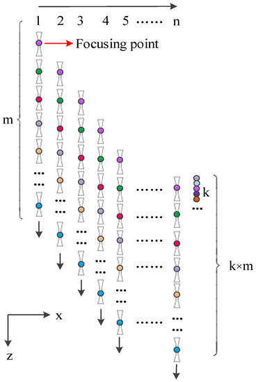 The vibration amplitudes of the particles generated in the imaging body were almost the same when the same focal probe stimulated a phantom at the different focal point positions. Thus, the obtained electrical conductivity amplitudes near the focal point positions were probably the same when the conductivity variations were similar. Based on this principle, a new conductivity imaging modality known as the focusing imaging method (mfMAET-CPS) was introduced in this work. Similar to the sfMAET-CPS method, a focal probe was used for step scanning along z-axis and x-axis and was controlled by the MC600 controller. In order to improve the conductivity resolution and reduce the imaging time, more conductivity values near the focal point were exploited for increasing the imaging points. In the mfMAET-CPS, the focal probe was adjusted at the start focusing position of the imaging area, then, the probe sent 10 chirp signals to stimulate the target phantom; 10 surface voltages of the phantom were received by a pair of silver-plated copper electrodes placed close to both sides of the target sample. Both the stimulating signals and the received signals were averaged and a conductivity curve from the probe to the bottom of the phantom was obtained after the digital coherent demodulation of the two signals, and k conductivity values at the focal point and its adjacent points were extracted from the conductivity curve, and then the focal probe was moved down a step length to the next excitation position in the z-axis. Total m conductivity curves along the ultrasonic propagation direction were derived from the ultrasonic stimulating signals and the received signals. Therefore, there were m × k conductivity amplitudes at each focal point and nearby points, which were extracted from the m conductivity curves. With those data and their position information, a synthetic conductivity curve along the ultrasonic propagation direction was derived. Subsequently, the probe went back to the initial position (the start focusing position) and then moved forward a unit in the x-axis, repeating the aforementioned process, and then other m × k amplitudes at each focal point and nearby points along the z-axis were achieved. After finishing the n stepscan movements in the x direction, n synthetic conductivity curves with m × n × k conductivity values in the depth direction were achieved and the 2D conductivity contribution in the xz plane area was achieved after combining the scanning position in the x-axis with the n synthetic conductivity curves (total k × m × n conductivity amplitudes at each focal point and its nearby points). The imaging process diagram of the mfMAET-CPS is shown in Figure 7.