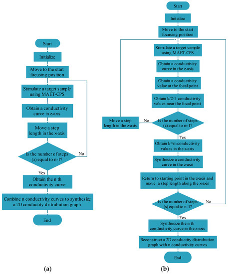In the sfMAET-CPS, a focal probe was used for stimulating a target sample along the z-axis, and the step motions of the probe along the x-axis were controlled by the MC600 controller. In the imaging processing, first, the probe was adjusted in a start stimulating position. Then, the probe sent 10 chirp signals to stimulate the target phantom; 10 surface voltages of the phantom were received by a pair of silver-plated copper electrodes placed close to both sides of the target sample; and after digital coherent demodulation, a conductivity curve along the z-axis was obtained. Second, the probe was moved along the x-axis for a step length, and then, the second conductivity curve along the z-axis was derived by repeating the above mentioned process and different conductivity curves along the z-axis were achieved. After finishing the n stepping motions in the x-axis, the 2D conductivity contribution in the xz plane area was presented after combining n conductivity curves with the probe position in the x-axis. The imaging process of the sfMAET-CPS is shown in Figure 6.