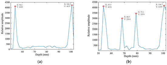 In order to test the accuracy of the mfMAET-CPS, a homogenous gelatin phantom with a cuboid-shaped hole of 12 × 10 × 30 mm in the middle was used as the target sample. An ultrasonic focal probe was placed at the 54 mm position above the upper surface of the phantom, and the stimulating positions of the two experiments are shown in Figure 9. When the probe was placed at the first starting stimulating position (i.e., ultrasound passed through only two layers of conductivity change interface), the probe sent 10 chirp signals to stimulate the target phantom; 10 surface voltages of the phantom were received by a pair of silver-plated copper electrodes .Then, a conductivity curve was formed and conductivity amplitude at focal point was obtained. A total of 30 stepscan movements along the ultrasonic propagation direction were performed by repeating the aforementioned operations, and then a synthetic electrical conductivity curve using 30 conductivity curves obtained at different excitation depths was derived by the mfMAET-CPS, which is shown in Figure 10a. Two peak points with the same levels of amplitude—(54.2, 4043) and (100.3, 4137)—were also achieved and the two peak points meant the maximum peak points of conductivity variation. In additon, the two peak values stood for the positions of condutivity variation in the z-axis. By measuring the distance between the two peak points, the calculated distance between the two interfaces of conductivity variation was 46.1 mm. In additon, the ultrasound B-mode imaging method was used to image the target phantom by our Verasonics system, five position points of each interface of the B-mode imaging were randomly exacted and averaged, and the mean value was used as the measured value; therefore, the calculated thickness between the upper and lower interface of the target sample was obtained, and the calculated values obtained by the mfMAET-CPS were close to the measured phantom thickness of 46.6 mm. The detailed interface positions were measured and are presented in Table 2. The accuracy in the z-axis was as high as 98%, which validated the accuracy of the mfMAET-CPS and indicated that the MAET-CPS can be applied to detect the interface of conductivity variation of the phantom.