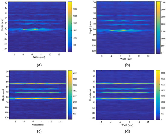 A homogenous gelatin phantom (75 × 29 × 30 mm) with a cuboid-shaped hole of 10 × 8 × 30 mm in the middle was conducted for conductivity imaging experiments. As shown in Figure 11, an ultrasonic focal probe was placed above the upper surface of the phantom and was used for conductivity imaging, and 2D electrical conductivity distributions in the imaging area were clearly obtained by the single-focus B-scan imaging and the mfMAET-CPS, respectively, which are shown in Figure 12a,c. In two different imaging experiments, the stepscan movement in the x-axis was set as 0.45 mm, the stepping motion along the x-axis was performed 31 times, and the mfMAET-CPS was performed 30 times along the z-axis and each step length was set to 1.8 mm. The conductivity imaging results are shown in Figure 12, in which Figure 12a is the 2D conductivity distribution of the sfMAET-CPS, Figure 12b is the 2D conductivity distribution of the sfMAET-CPS after being processed by the linear interpolation algorithm, Figure 12c shows the 2D conductivity distribution of the mfMAET-CPS, and Figure 12d is the 2D conductivity distribution of the mfMAET-CPS after being processed by a linear interpolation algorithm.