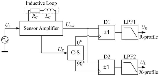 Block diagram of the conditioning system cooperating with the IL sensor comprised of a sensor amplifier (Figure 1), where: the C-S block provides two signals shifted by 90 degrees in relation to each other; D1, D2—synchronous demodulators; LPF1, LPF2—low-pass filters.