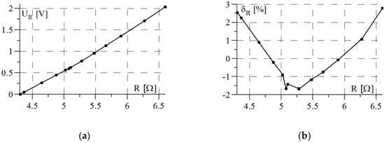 Characteristics of inductive sensor resistance measurement channel: (a) static; (b) relative nonlinearity error.