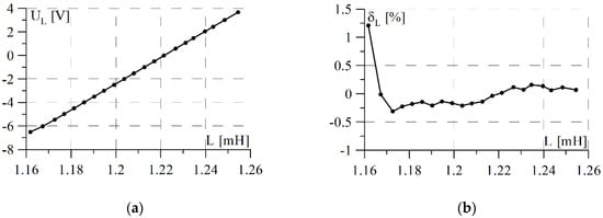 A prototype of the measurement system was subjected to laboratory tests using a small-scale inductive sensor. The purpose of the study was to determine the static characteristics of the system and identify any processing errors. In the course of the study, metal objects with different magnetic properties were introduced into the sensor operating field and the output voltage of the system was measured each time. For each case, the sensor impendence parameters were measured by means of an Agilent E4980A Precision LCR Meter. The results obtained are presented in Figure 3 and Figure 4 in the form of static characteristics and their nonlinearities with respect to linear regression.