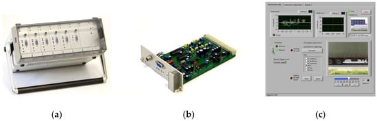 Multichannel measurement system: (a) multichannel conditioning system; (b) single card of the system; (c) graphical user interface of the system; (d) research stand diagram, where: IL1—sensor for vehicle detection; IL2 and IL3—narrow IL sensors for axle detection; P1 and P2—piezoelectric load sensors for axle detection; MC—multichannel conditioning system (shown in Figure 5a) equipped with dedicated cards for individual sensors (VD—vehicle detector card; AD1 and AD2—axle detection cards, PD—card for piezoelectric sensors).