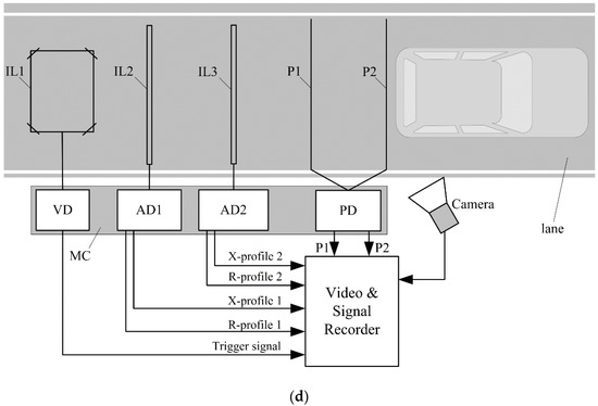 The multichannel measurement system, whose structure is shown in Figure 5d, was used on a road stand, where the experimental research was carried out. The measuring stand is located in Poland on national road No. 81. It is a two-lane road, and the system is installed in the slower lane. At the place of measurement the speed limit is 70 km/h. Traffic density in this location is around 10,000 vehicles per day, and the flow of vehicles is free (no stops or real speed changes). The traffic structure is mixed (around 70% passenger vehicles, 30% delivery vehicles and trucks). Moving the system to a location with similar traffic conditions will not affect the quality of the results. Problems could occur when locating the system in urban traffic conditions where vehicle stops and sudden changes in speed are to be expected. The authors did not conduct research under such conditions, nor does the algorithm for processing vehicle profiles take these into account.