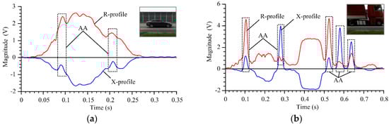 Examples of R- and X-profiles from narrow IL sensor: (a) passenger vehicle (low suspension); (b) truck vehicle (high suspension); where: AA—refers to the areas where there are artifacts originating from the vehicle axles.