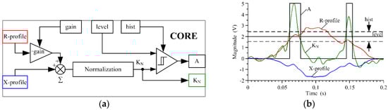 A functional block diagram of the proposed axle detection algorithm-core is shown in Figure 7a. The R-profile obtained from the conditioning system is enhanced in the gain block, and then added to the X-profile. The gain value is properly selected for a given vehicle group so as to highlight the artifacts coming from the vehicle axles. The resulting signal samples are divided by the maximum value found before in this signal, and the obtained signal samples are then multiplied by 5; in this way a KN signal is computed, which is available at the output of the normalization block. The normalized signal is then transferred to the input of the programmable comparator with hysteresis, where: ‘level’ refers to the reference level of the comparator, and ‘hist’ refers to the width of the hysteresis loop. Sample results of the detection algorithm-core execution, along with input signals: R-profile and X-profile, and output signals: A and KN, are shown in Figure 7b.