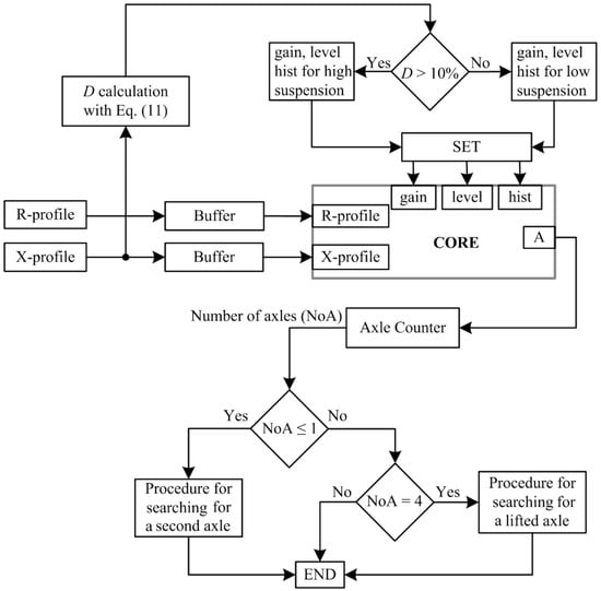 The algorithm requires the registered the R and X-profiles to be in buffers, i.e., it can be run after the registration of vehicle profiles has been completed. The acquisition time of the profiles depends on vehicle speed, length and running path in the decision tree. This means that, in the final display, the results depend on time. If the R and X-profiles exist in memory buffers, the proposed algorithm is performed on a standard PC within a time of no longer than 0.1 s. The axle detection algorithm, supplemented with the algorithm for measuring the distance between axles, can be used in an automatic vehicle classification system.