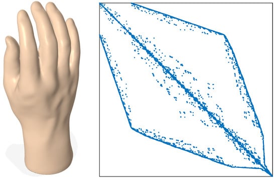 Figure 1 displays a 3D hand model and its weighted Laplacian matrix, with weights , where denotes the Euclidean norm. The sparsity pattern (or support) of is the set of indices, , with .