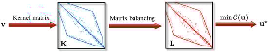 Sinkhorn matrix balancing: Applying the Sinkhorn matrix balancing procedure [] to the kernel similarity weight matrix, , yields a symmetric non-negative doubly stochastic filtering matrix, , given by